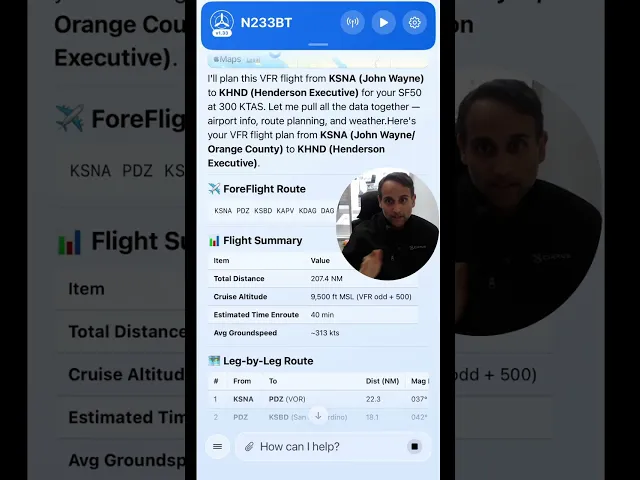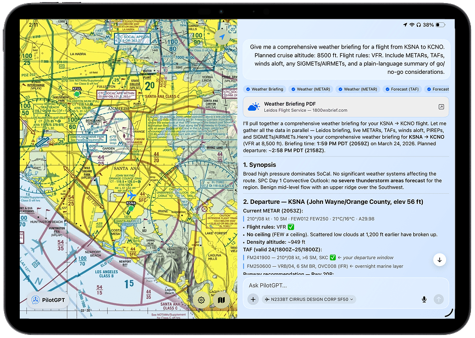 PilotGPT is trained on your plane, works offline, and helps with anything from route planning, weather briefs, to pulling up checklists in the cockpit. Never feel like you're getting behind again.